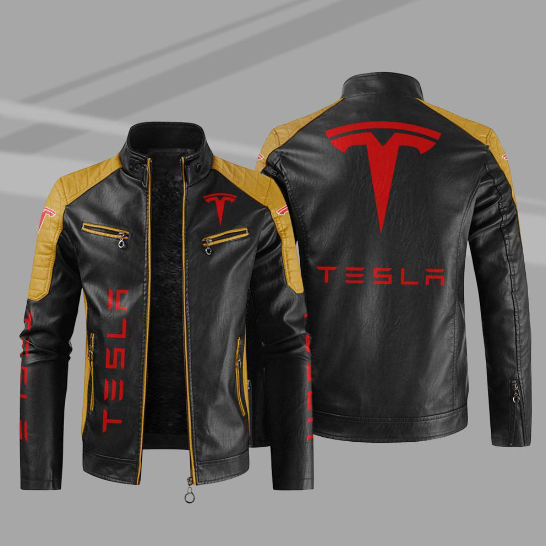 Q: How does the jacket's design reflect Tesla's electric vehicles? A: The racing-inspired design, sleek lines, and perforated leather panels add a touch of innovation, drawing inspiration from Tesla's electric vehicles.